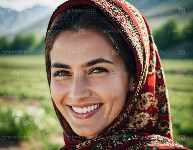 Таджикская женщина 30 лет грациозно стоит, демонстрируя свой традиционный наряд на захватывающем фоне гор и сочных зеленых полей, отражающих ее культурные корни. Сгенерировано с помощью ИИ