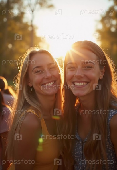 Двое друзей излучают счастье, наслаждаясь солнечным моментом, наполненным смехом и удивлением. Окруженные природой, они создают неизгладимые воспоминания под золотыми лучами