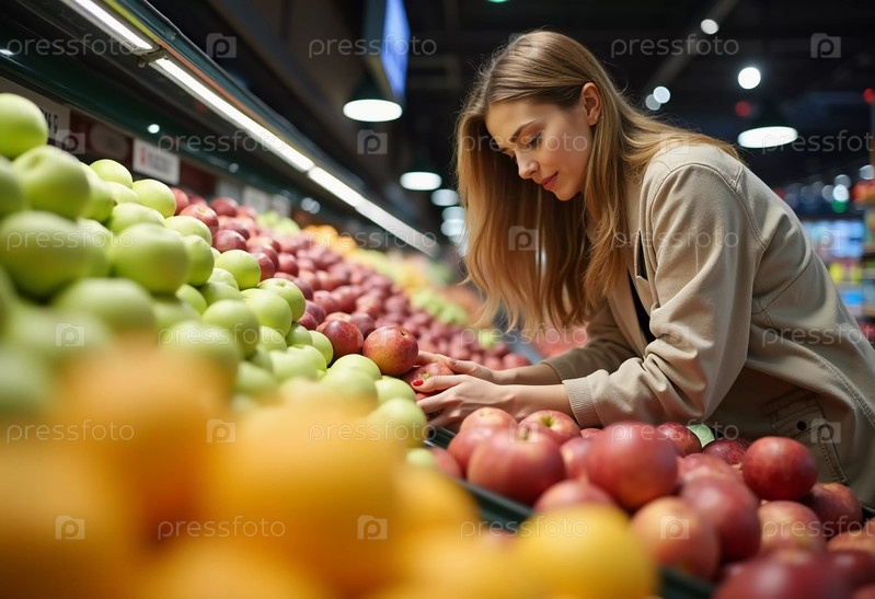 В шумном супермаркете женщина внимательно осматривает спелые яблоки, оценивая разнообразие перед собой. Она с радостью включается в процесс выбора полезных фруктов