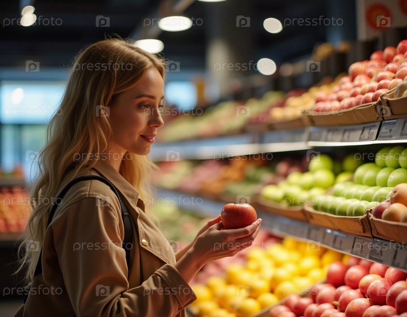 В оживленном супермаркете женщина рассматривает блестящее красное яблоко, задумчиво обдумывая свой выбор