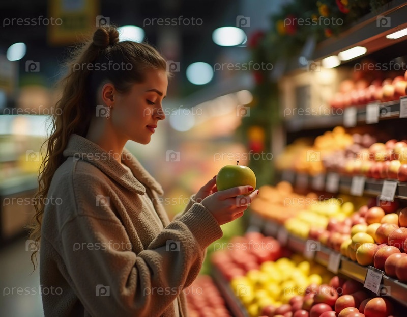 В оживленном супермаркете женщина задумчиво рассматривает блестящее зеленое яблоко
