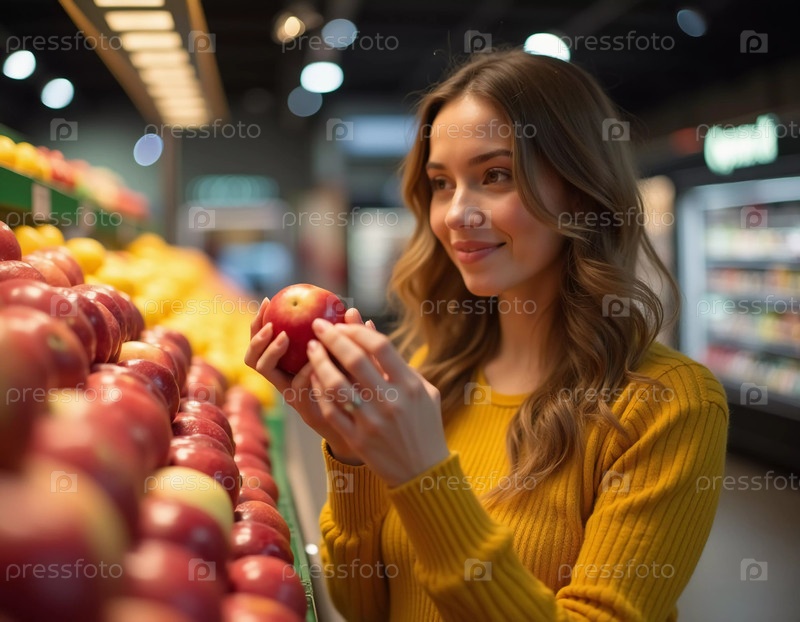 В оживленном супермаркете женщина в уютном желтом свитере внимательно осматривает красное яблоко среди аккуратно разложенных фруктов. Ее улыбка отражает радость от выбора свежих продуктов