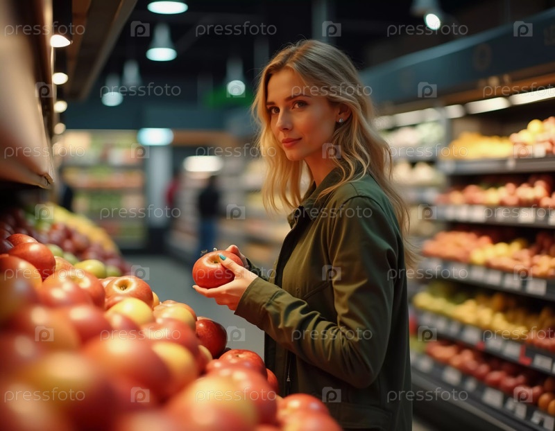 Женщина стоит задумчиво в супермаркете, держа ярко-красное яблоко в окружении аккуратно разложенных фруктов. Атмосфера оживленная и привлекательная, с различными продуктами, завлекающими покупателей