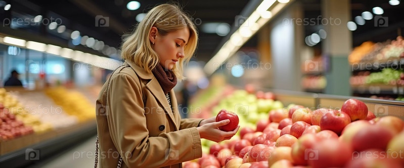 Молодая женщина стоит в оживленном супермаркете, тщательно выбирая блестящее красное яблоко из яркой витрины. Свежие фрукты окружают ее, создавая уютную атмосферу