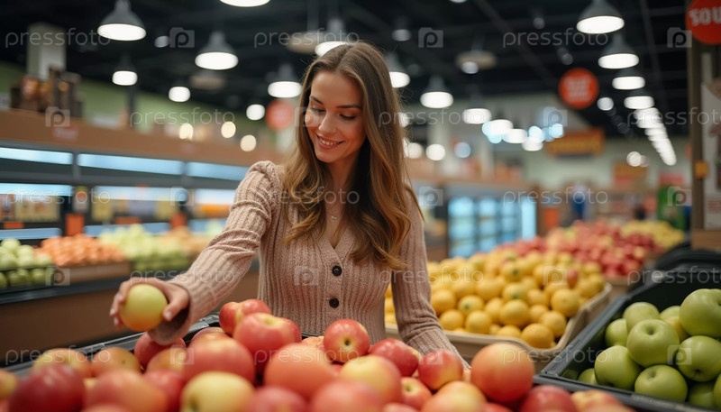 Женщина с длинными волосами просматривает витрину со свежими яблоками в оживленном супермаркете, ее улыбка излучает радость, когда она выбирает лучшие фрукты среди ярких цветов