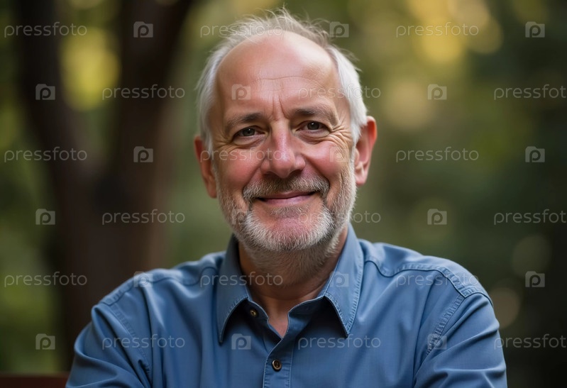Веселый мужчина-гражданин Израиля, демонстрирующий свою теплую улыбку, сидя на улице.Окружающая зелень мягко светится в угасающем солнечном свете, создавая мирную и гостеприимную атмосферу AI