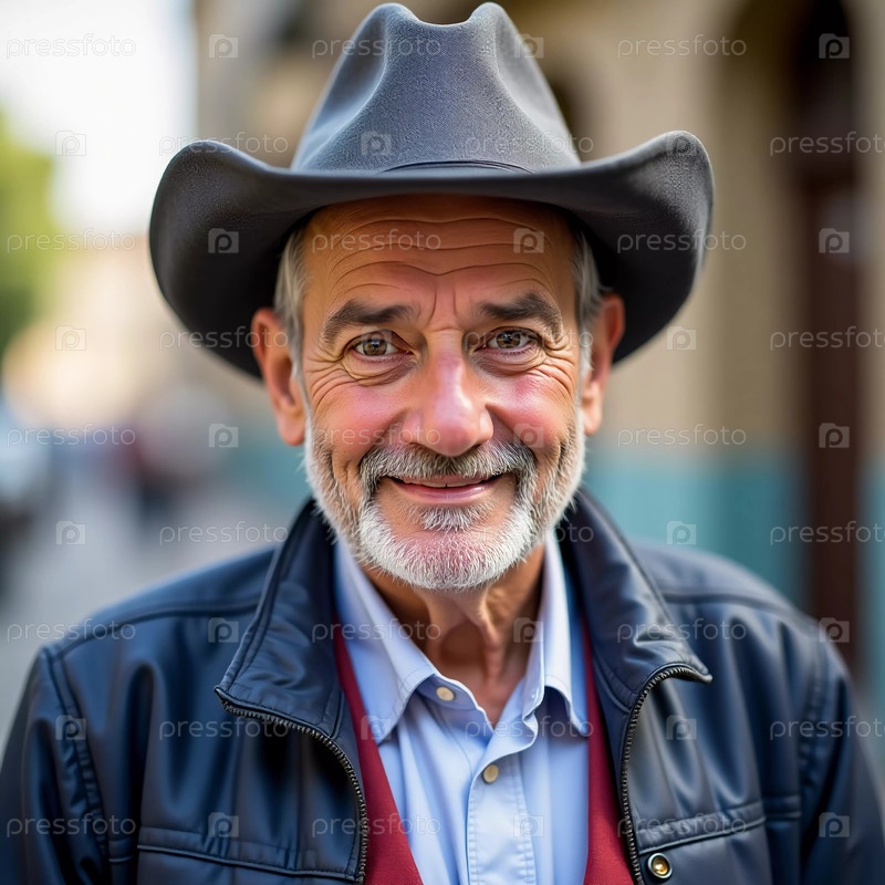 Дружелюбный мужчина уверенно стоит на оживленной улице в Израиле, в стильной шляпе и кожаной куртке. Его теплая улыбка отражает яркую культуру, приглашая всех общаться и делиться историями