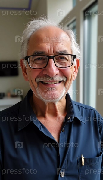 Веселый мужчина из Израиля стоит в хорошо освещенной комнате с большими окнами. Его дружелюбная улыбка демонстрирует теплоту и доступность, создавая гостеприимную атмосферу, которая манит и успокаивает