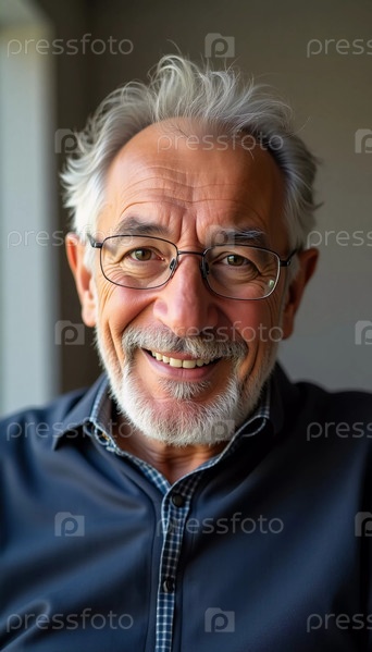 Пожилой мужчина-житель Израиля удобно сидит в помещении, сияя от радости. Его серебристые волосы и борода обрамляют лицо, наполненное теплом и мудростью, отражая мирный полдень