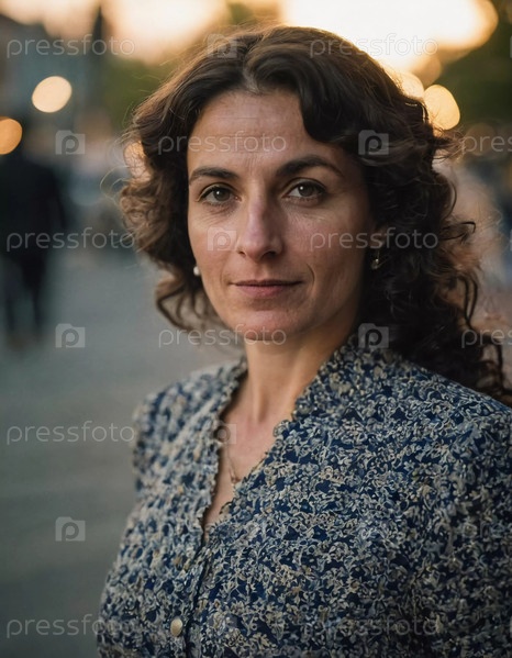 Женщина с вьющимися волосами излучает уверенность, стоя на городском фоне в Израиле в сумеречные часы. Теплый свет заходящего солнца добавляет прекрасную атмосферу