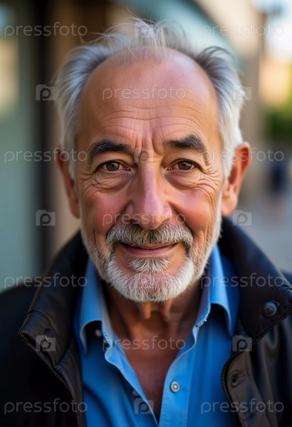 Пожилой мужчина с теплой улыбкой стоит в оживленном городском районе, солнечный свет освещает его черты лица AI