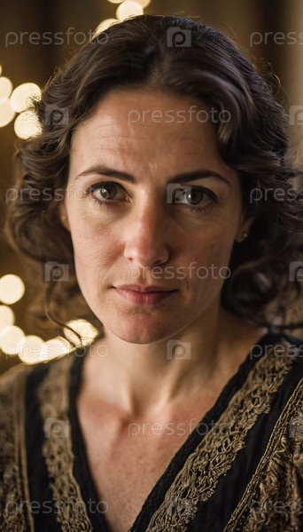 Женщина стоит с задумчивым видом, ее вьющиеся волосы обрамляют ее лицо. Мягкий свет создает теплую атмосферу, подчеркивая ее черты и приглашая к размышлению