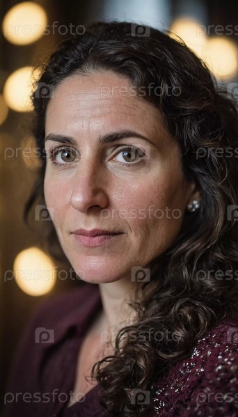 Под мягким светом света женщина излучает уверенность и уравновешенность. С ее кудрявыми волосами, обрамляющими ее лицо, она улавливает суть израильской культуры и духа, момент красоты и стойкости