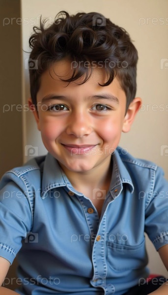 Мальчик с вьющимися волосами и яркой улыбкой удобно сидит в помещении, излучая счастье. Его дружелюбное поведение добавляет теплоты в интимную обстановку, передавая суть детской радости