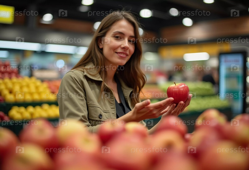 Женщина стоит в красочном супермаркете, тщательно выбирая яблоко с витрины. Окруженная различными фруктами, она улыбается, наслаждаясь процессом покупки продуктов