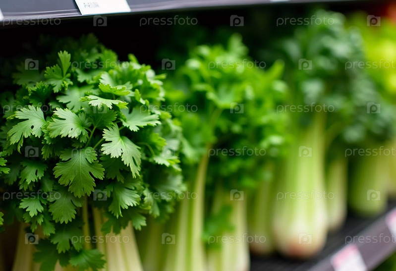 Пышные пучки петрушки и свежего сельдерея аккуратно разложены на прилавке супермаркета, приглашая покупателей исследовать свежие продукты в яркой, оживленной атмосфере