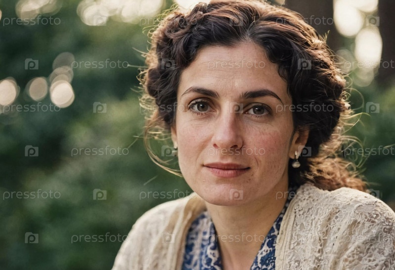 Женщина лет тридцати спокойно размышляет, сидя в мирной природной обстановке в Израиле. Солнечный свет проникает сквозь деревья, создавая теплую атмосферу