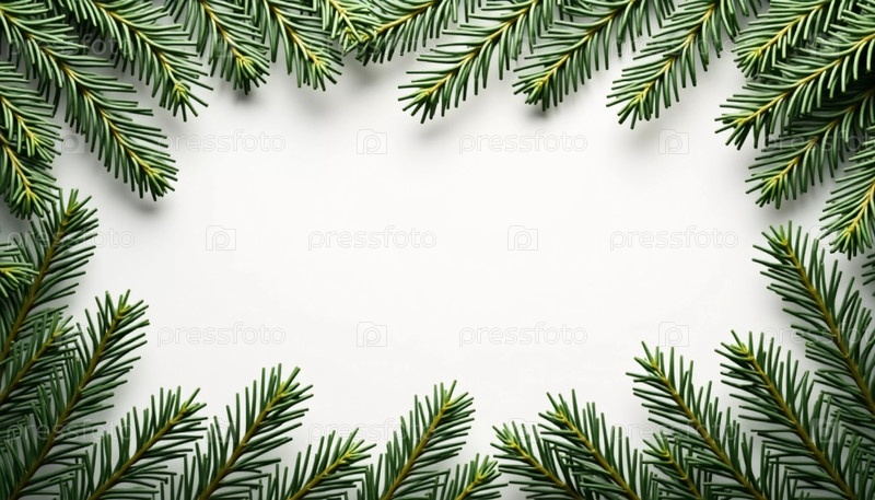 Нежные еловые ветки обрамляют чистый белый холст, создавая безмятежную и праздничную атмосферу, вызывающую в памяти радость рождественского сезона и красоту природы. Генеративный искусственный интеллект