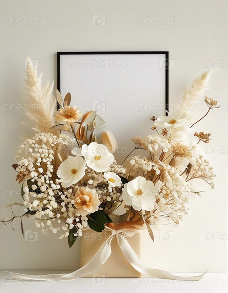 Нежные белые цветы, словно с открытки, в сочетании с воздушной гипсофилой создают прекрасную цветочную композицию, изящно расположенную в вазе нейтрального тона на минималистичном фоне. Генеративный ИИ