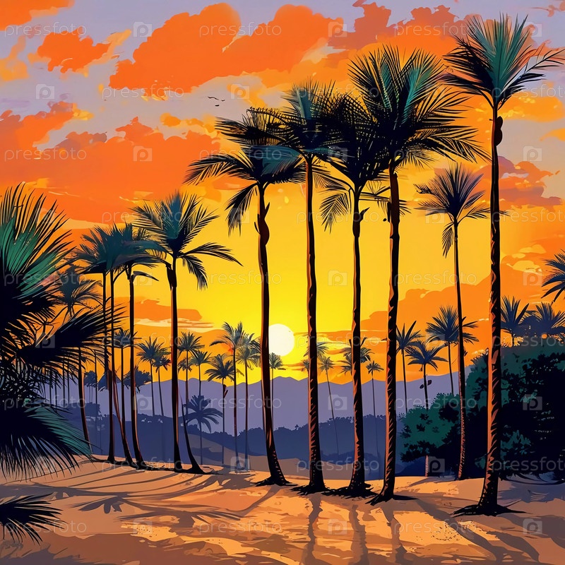 Высокие пальмы вырисовываются на фоне яркого заката, отбрасывая тени на песок по мере того, как садится солнце, окрашивая небо в огненные цвета Генеративный ИИ