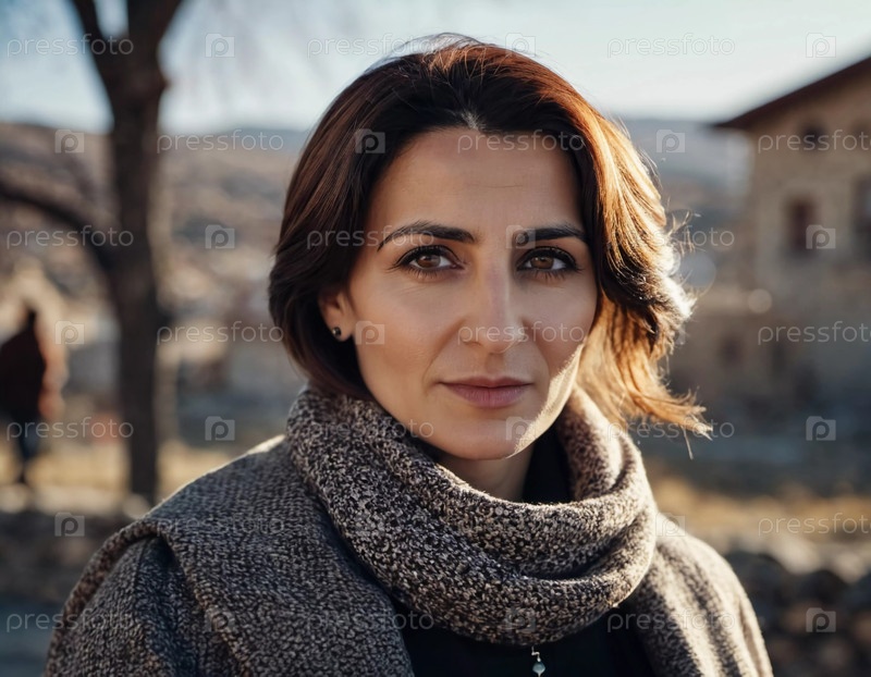 В тихой сельской местности женщина армянского происхождения излучает уверенность, ее элегантный шарф обрамляет лицо, она наслаждается очарованием своей окружающей среды и культурных корней