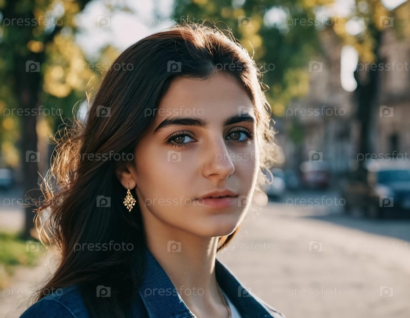 На залитой солнцем улице красивая армянка задумчиво смотрит, ее темные волосы ловят свет. Яркие деревья и мягкие осенние цвета добавляют теплоты моменту