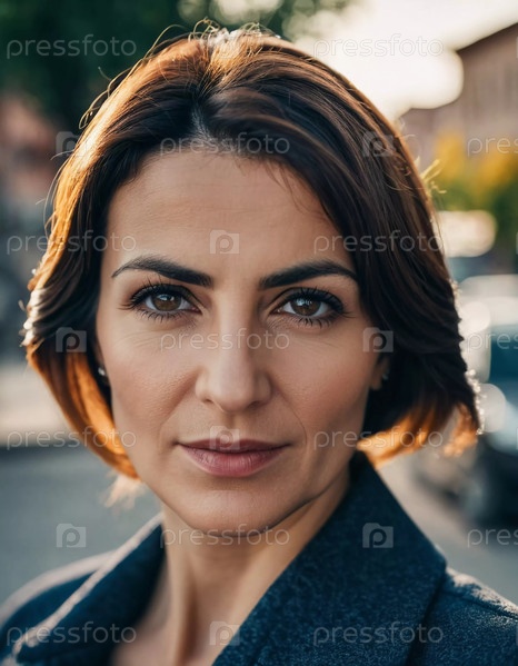На снимке, сделанном на оживленной армянской улице в золотой час, женщина с яркими чертами лица и короткой стрижкой излучает уверенность, излучая тепло и силу на мягком городском фоне