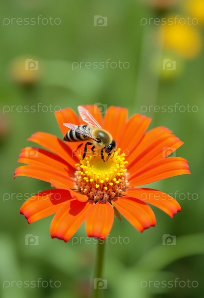 В оживленном саду, украшенном яркими цветами, трудолюбивая пчела собирает нектар с яркого цветка апельсина, воплощающего суть летней красоты и гармонии природы. Генеративный ИИ