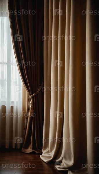 Богатые шелковые шторы изящно обрамляют окно, источая роскошь и тепло. Нежный утренний свет проникает сквозь них, освещая элегантную комнату мягким сиянием и приглашая к комфорту Генеративный ИИ