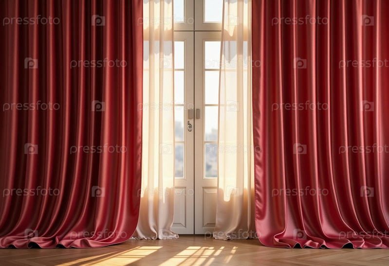 Богато окрашенные шелковые шторы обрамляют окно, мягко освещенное золотистым солнечным светом. Роскошная ткань создает уютную атмосферу, идеальную для релаксации и комфорта Генеративный искусственный интеллект