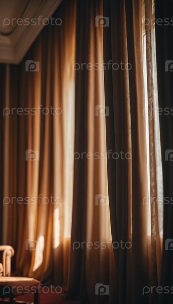 Мягкий солнечный свет проникает сквозь изысканные шелковые занавески, освещая спокойную комнату. Богатые текстуры и теплые тона создают безмятежную атмосферу, идеально подходящую для релаксации