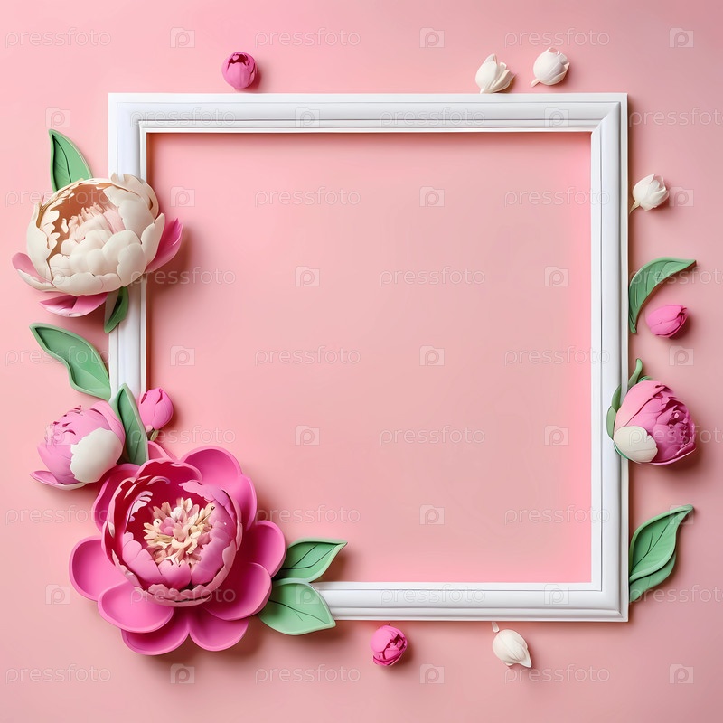 Пионы белого, розового и бежевого цветов окружают белую рамку, создавая очаровательный центр внимания на мягком пастельном фоне, идеально подходящем для произведений искусства или сообщений