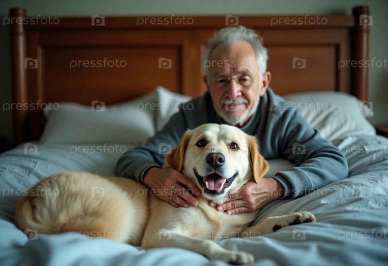 Пожилой мужчина сидит на мягкой кровати, счастливо улыбаясь, разделяя согревающий душу момент со своей веселой собакой. Их связь излучает радость и комфорт в спокойной обстановке