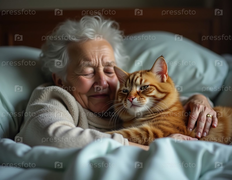 В тихой спальне пожилая женщина тепло улыбается, обнимая своего рыжего кота, создавая мирную атмосферу любви и комфорта. Мягкое постельное белье добавляет уюта Генеративный ИИ