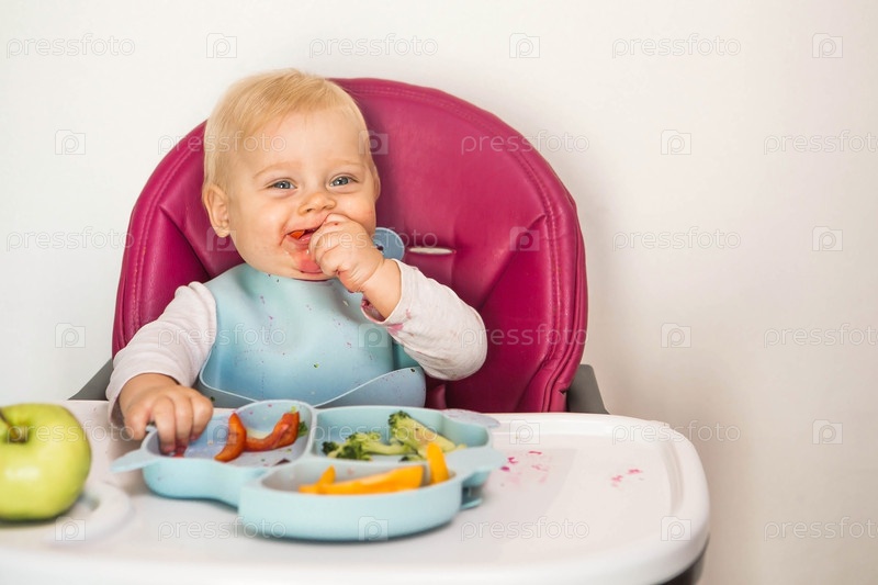Детское питание. Первый прием пищи. Кормление ребенка. Милый маленький ребенок ест овощи. Здоровая еда. Ребенок сидит на высоком стульчике для кормления. Свежие овощи и фрукты