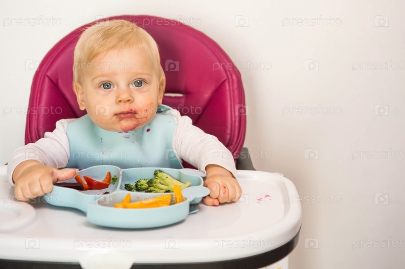 Детское питание. Первый прием пищи. Кормление ребенка. Милый маленький ребенок ест овощи. Здоровая еда. Ребенок сидит на высоком стульчике для кормления. Свежие овощи и фрукты