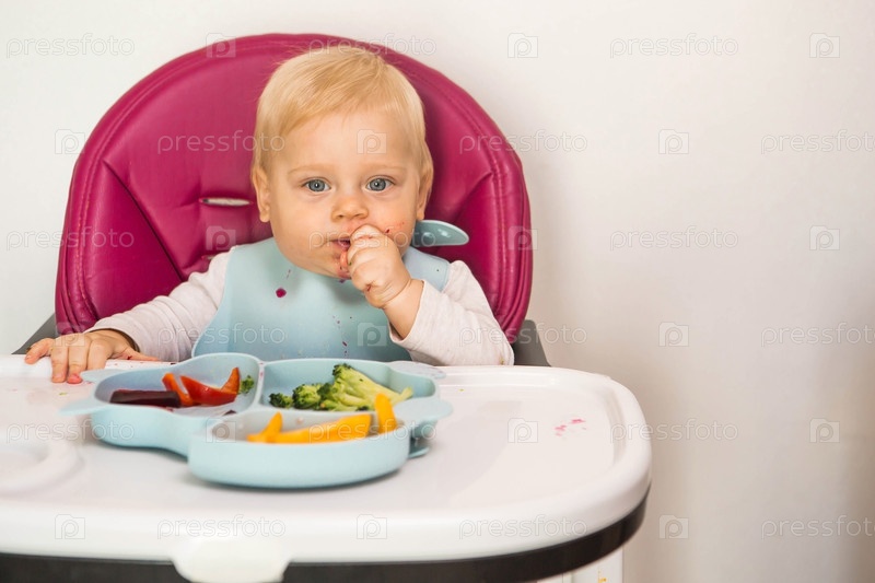 Детское питание. Первый прием пищи. Кормление ребенка. Милый маленький ребенок ест овощи. Здоровая еда. Ребенок сидит на высоком стульчике для кормления. Свежие овощи и фрукты