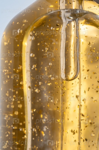 24-каратное золотое средство по уходу за кожей в стеклянной бутылке крупным планом. Макрос текстуры продукта для косметического ухода