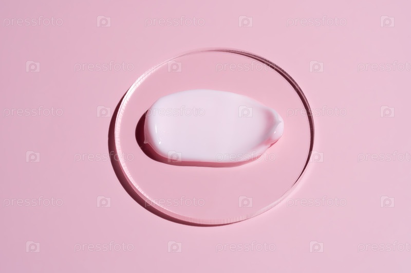Розовый косметический крем для лица или увлажняющий лосьон для тела мазки на пастельно-розовом фоне в чашке Петри. Гигиена, средство по уходу за кожей с кремовой текстурой. Образец мазка крема для лица красоты на цветном фоне
