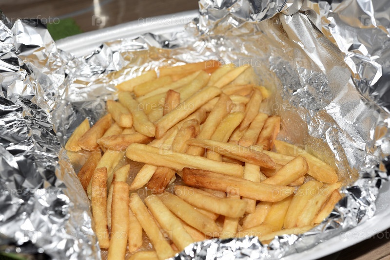Картофель фри в алюминиевой фольге. Жареный картофель в упаковке. Фастфуд