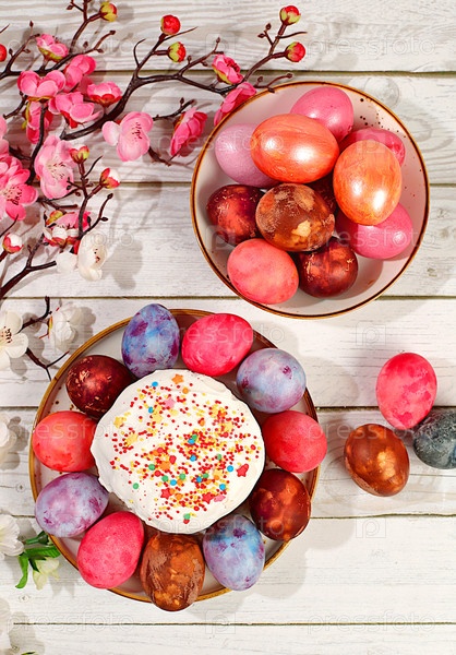 Традиционный кулич и мраморные пасхальные яйца, расписанные луковой шелухой, чай каркаде и розовый матча с ветками сакуры, концепция празднования Пасхи, идеи пасхальных блюд для домашней кухни