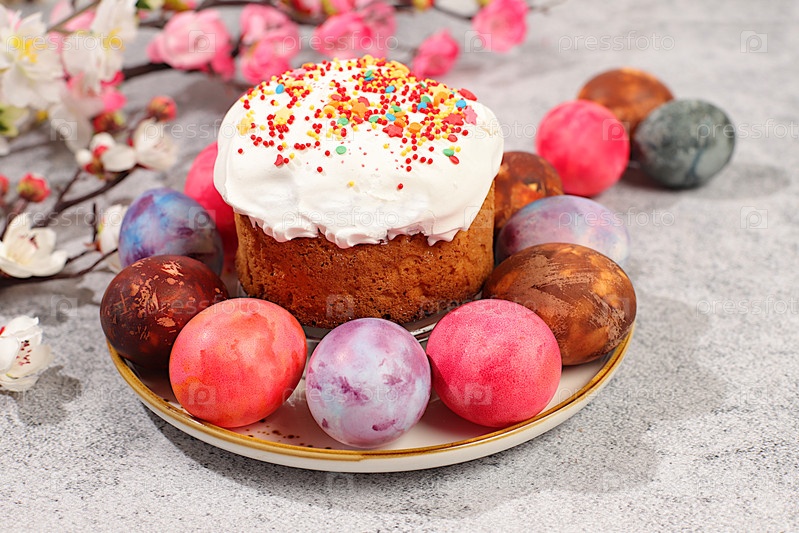 Концепция празднования Пасхи, традиционный кулич и мраморные пасхальные яйца, расписанные луковой шелухой, чай каркаде и розовый матча с ветками сакуры, идеи для домашних пасхальных блюд