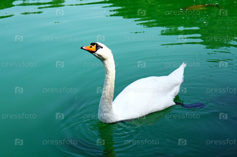 Изящный белый лебедь скользит по спокойному зеленому пруду