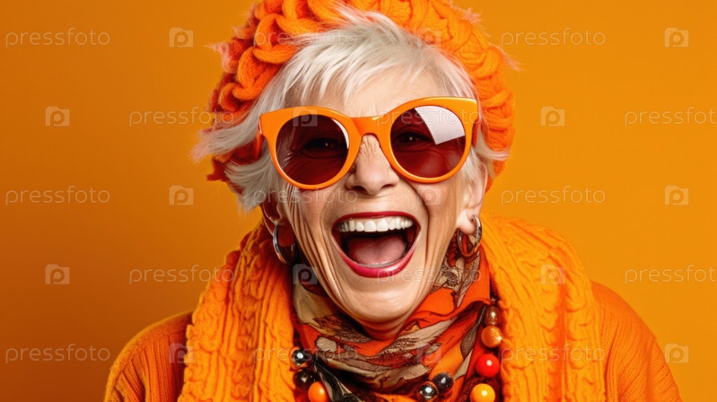 Яркая пожилая женщина в оранжевом наряде со стильными солнцезащитными очками и аксессуарами. Веселая улыбка, ретро, но современный вид и энергичная личность на оранжевом фоне
