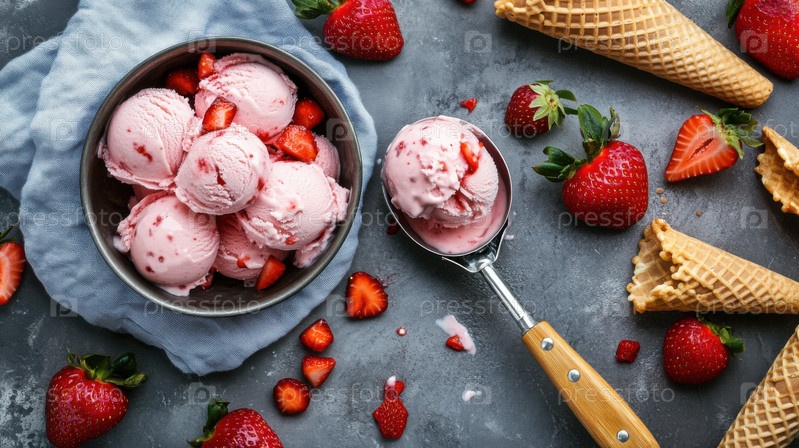 Вкусные шарики клубничного мороженого со свежими ягодами и вафельными рожками. Освежающий летний десерт на деревенской темной поверхности