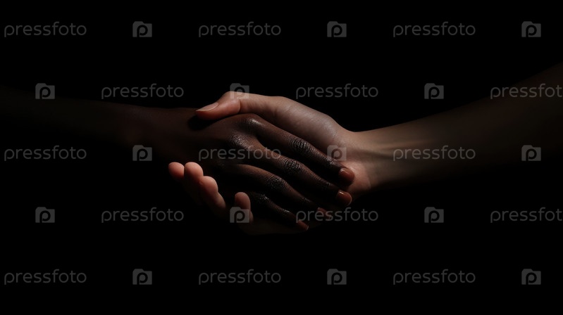 Крупный план разнообразных рук, пожимающих друг другу руки в единстве. Символический жест партнерства, доверия, равенства, командной работы и культурной солидарности на темном минималистском фоне