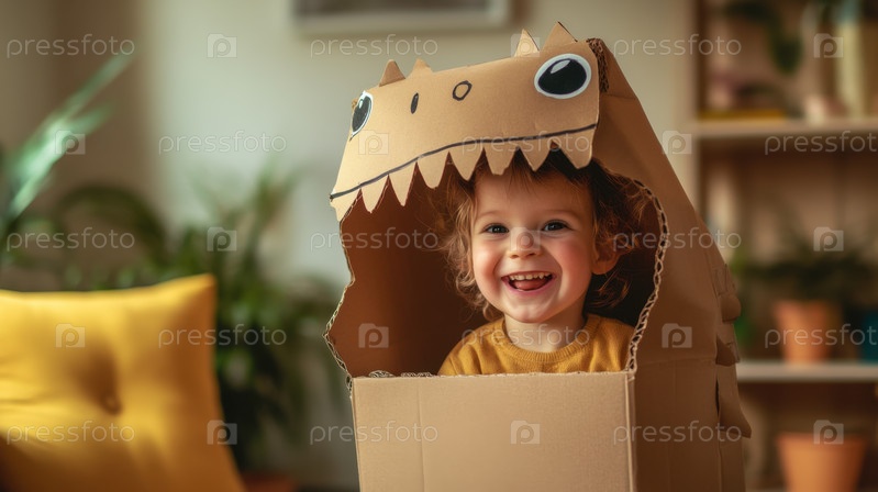 Улыбающийся малыш играет в самодельном картонном костюме динозавра. Веселое занятие в помещении, пробуждающее детское воображение, креативность и радостные семейные моменты
