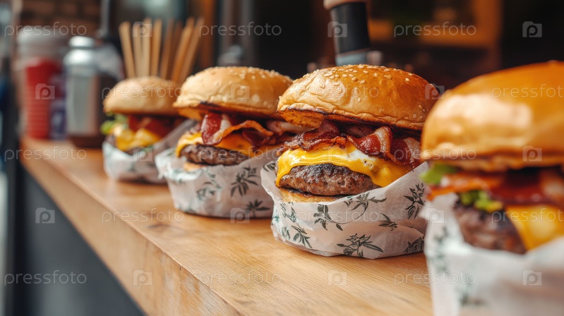 Сочные чизбургеры с беконом, говядиной, салатом и помидорами на стойке уличной еды. Идеальный фастфуд для фестивалей на открытом воздухе и неформальных обедов