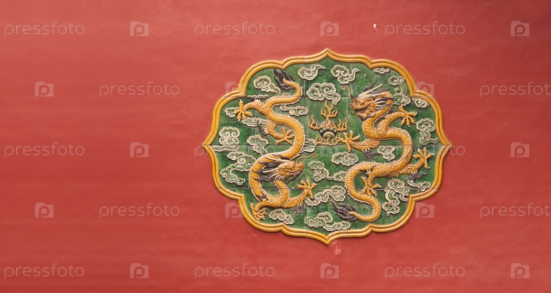Вид на двор Запретного города (Пекин, Гугун): керамический орнамент с драконами на фоне красной стены. Элемент дизайна с обтравочным контуром