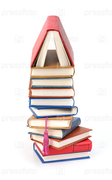 Стопка красных, синих, желтых и коричневых книг, изолированных на белом фоне